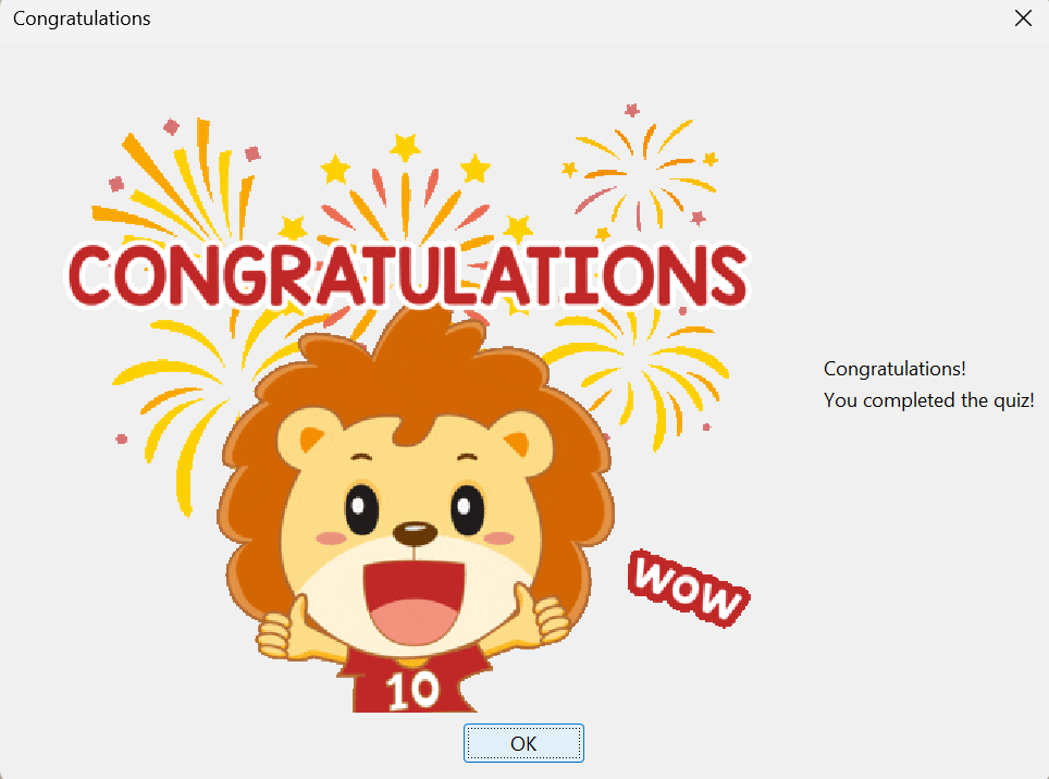 The result page displays animations and provides a summary of the quiz performance.
