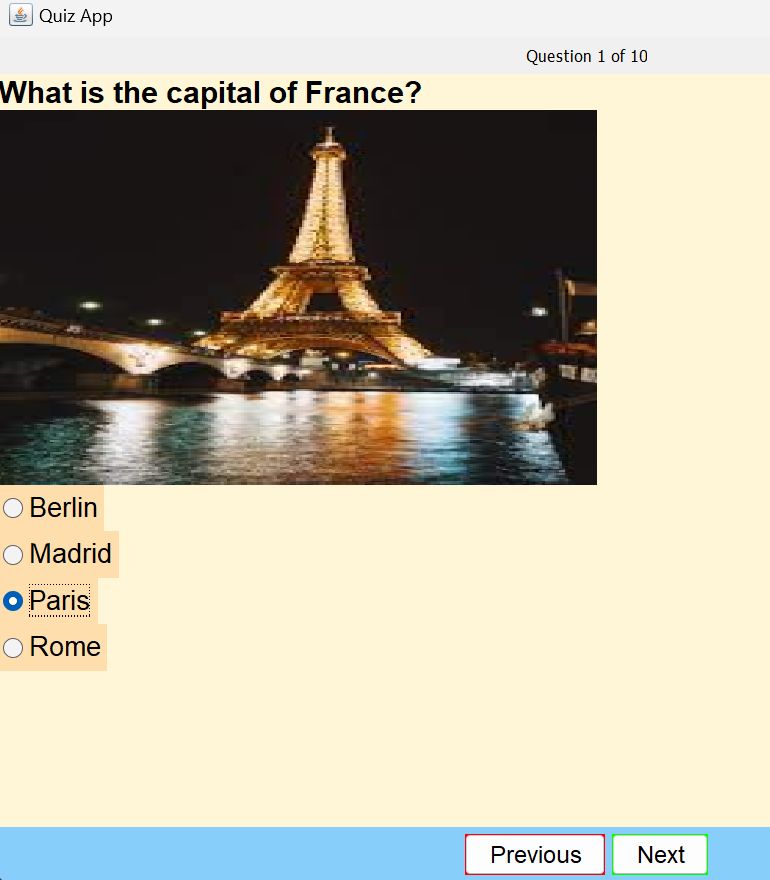 Developed a Java Swing application for conducting quizzes with interactive user interface and functionality.